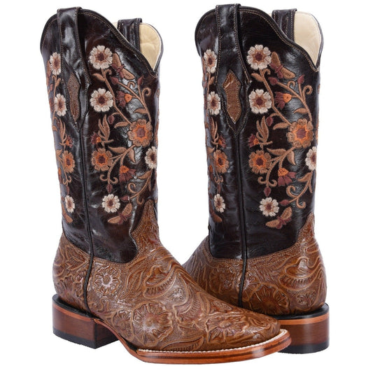 1506 Botas Rodeo para Mujer Cafe con Flores en Naranja y Tan
